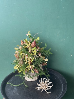 グリーンのグラデーションとスモーキーなシロタエギクをポイントにしたスワッグに、いろいろなお星様を作ったり、イメージしてデコレーション。